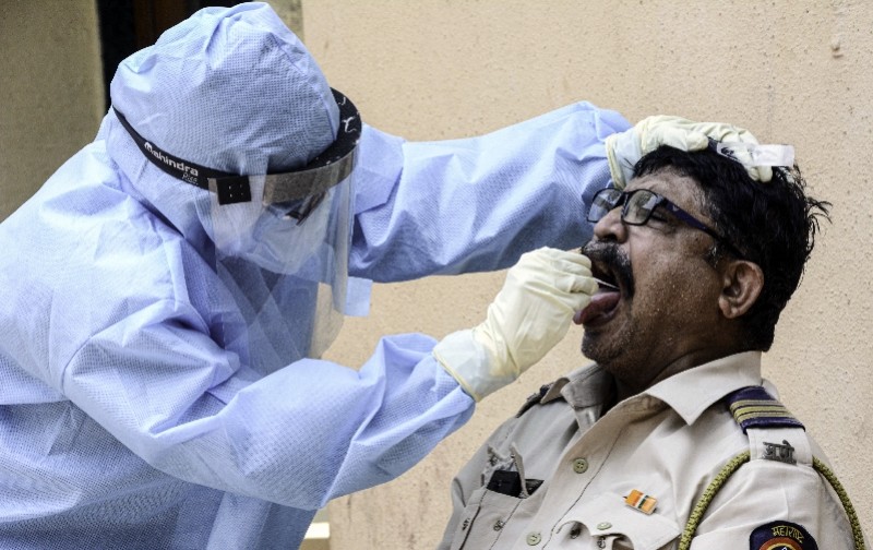 4月18日,医护人员在印度孟买塔拉维贫民窟进行新冠病毒检测。新华社发