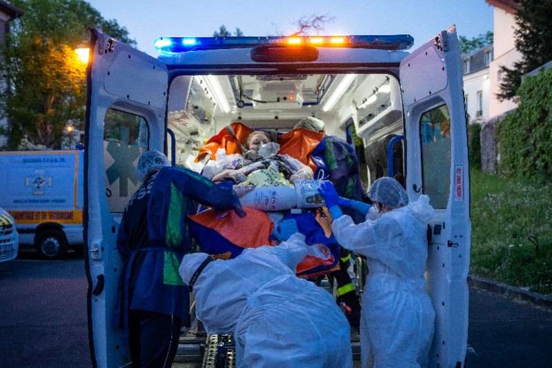 4月22日,在法国塞纳河畔埃皮奈一家失能老人养老院,法国民事保护部门的志愿者和急诊中心医护人员将疑似新冠病患抬上救护车。 新华社