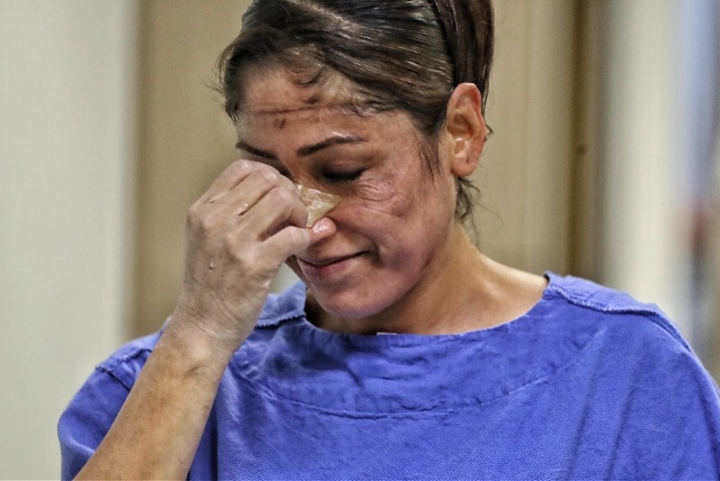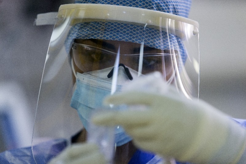 4月29日,在墨西哥首都墨西哥城的华雷斯医院,一名护士摘下面罩后脸上布满压痕。 新华社
