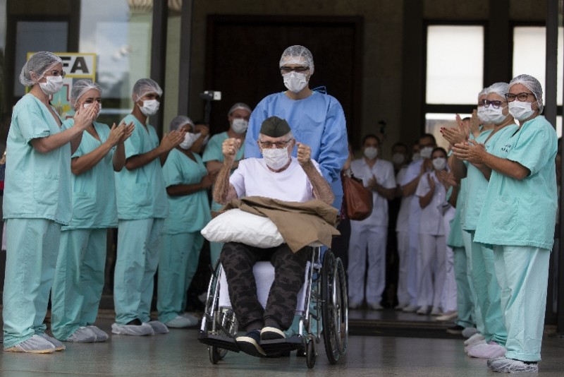 4月14日,在巴西首都巴西利亚武装力量医院,医护人员送百岁退役老兵埃尔南多・皮维塔(中)出院。据巴西国防部消息,感染新冠病毒的巴西百岁退役老兵埃尔南多・皮维塔当日下午痊愈出院。新华社
