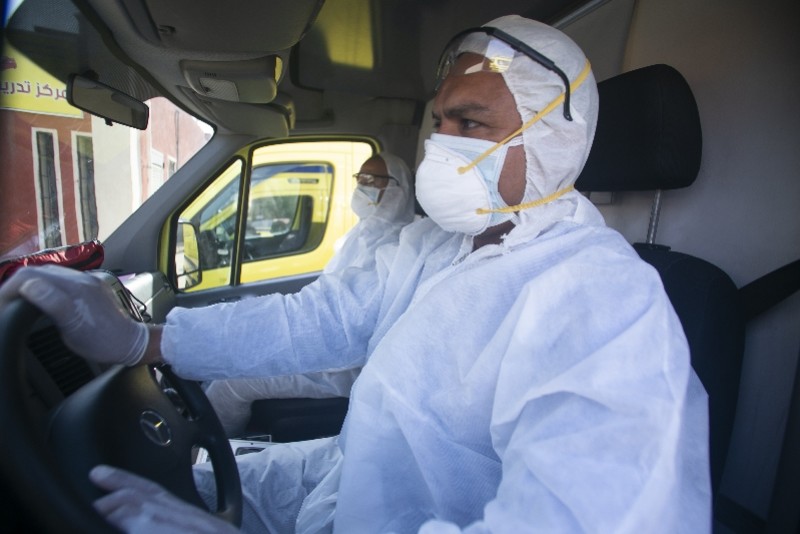 4月14日,在埃及开罗,医护人员在救护车内工作。 新华社发