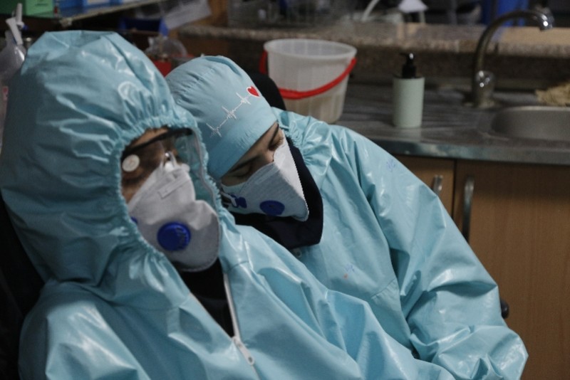 3月28日,伊朗一家医院,身穿防护服的医护人员在工作间隙休息。新华社