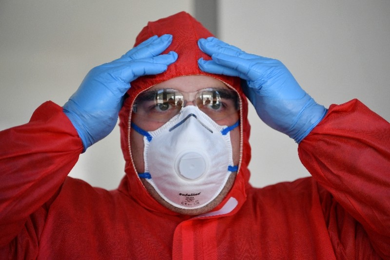 3月26日,在德国伦讷施塔特,医护人员在一处新冠病毒检测站检查自己穿戴的防护装备。 新华社