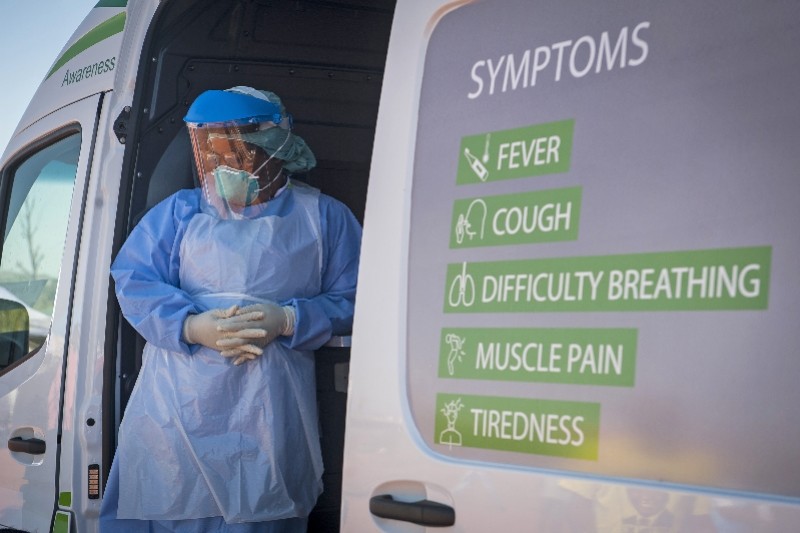 4月21日,在南非约翰内斯堡近郊,一名护士站在移动检测车上。 新华社