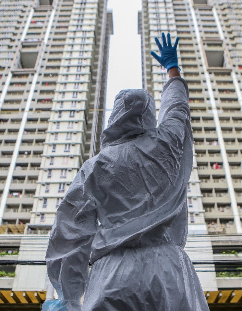4月9日,在菲律宾帕赛,一名身着防护服的医护人员向住宅楼上的居民挥手致敬,表达感谢。 新华社