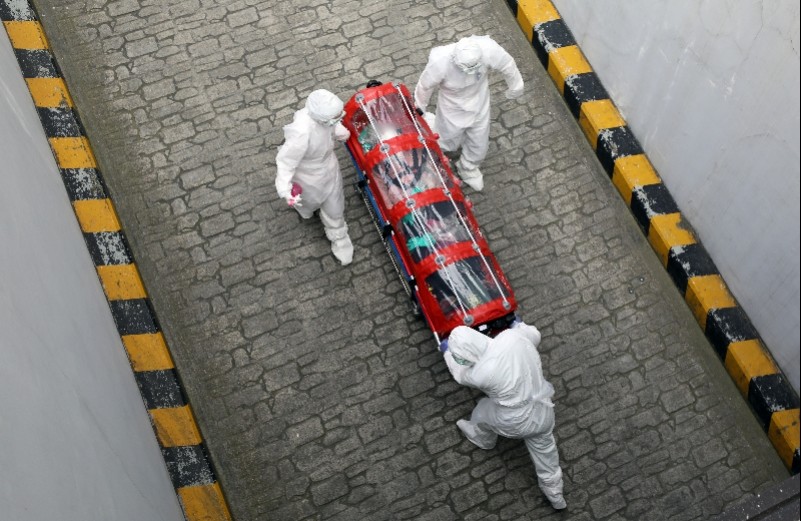 3月8日,在韩国首尔,医护人员转送一名重症患者前往传染病专科医院。新华社/纽西斯通讯社