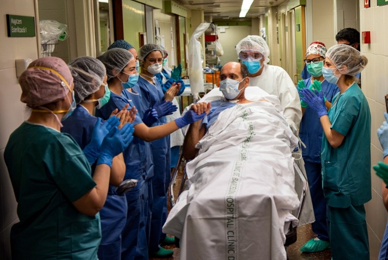 5月7日,在西班牙巴塞罗那的一家医院,一名新冠患者在离开重症监护室前和医护人员握手致意。 新华社