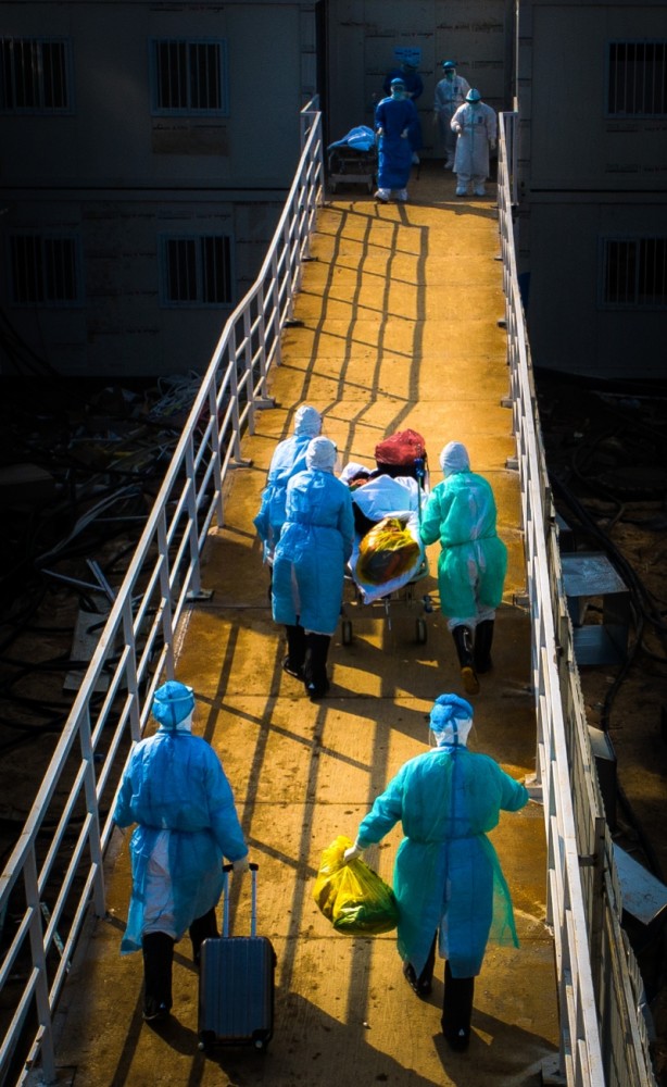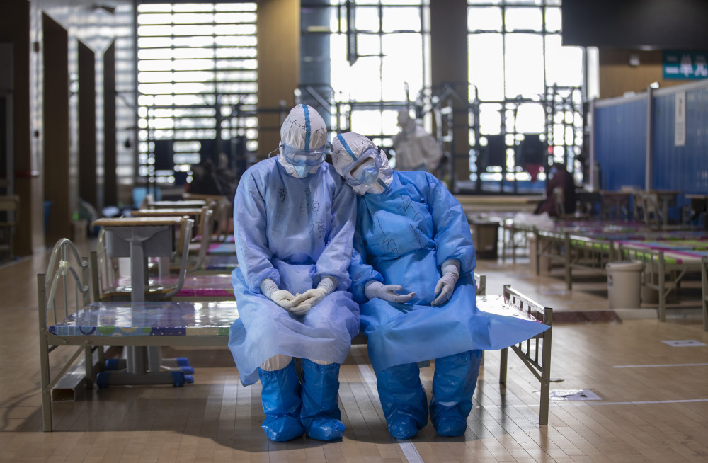 3月10日,在武昌方舱医院,疲惫不堪的护士在等待出舱时相互倚靠着小憩。3月12日,意大利《共和国报》在其头版和脸书账号的封面,发布了这张中国医护人员的照片。新华社