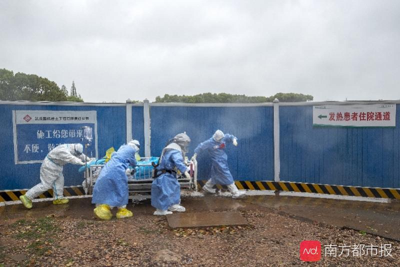 3月27日,湖北武汉挂起暴雨预警,来自广东支援武汉危重症救治医疗队的医生席寅、陈维校、护士陈丽珍、刘川(从右到左)四人协力转运患者。南都记者 谭庆驹 摄