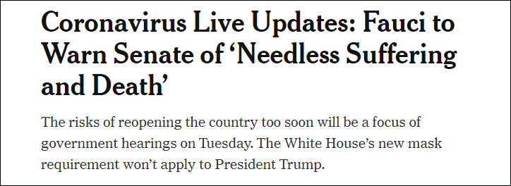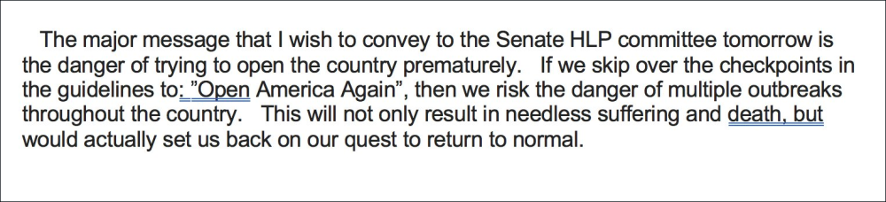 11日深夜,在给《纽约时报》记者的一封电子邮件中,福奇阐述了他第二天打算对参议员们说的话。他写道:“我希望明天向参议院HLP委员会传达的主要信息是,试图过早开放国家是危险的。”