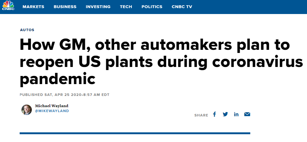根据今天 CNBC、彭博社,以及 Car and Driver 等媒体的综合报道,除了特斯拉以外,全球车企在美国境内的工厂,最迟将会在 5 月 18 号开始复工。其中奔驰的工厂已经在 4 月 27 号开始复工,宝马、现代、起亚的工厂也于 5 月 4 号正式复工,其他车企将会分批在 11 号/18 号复工。