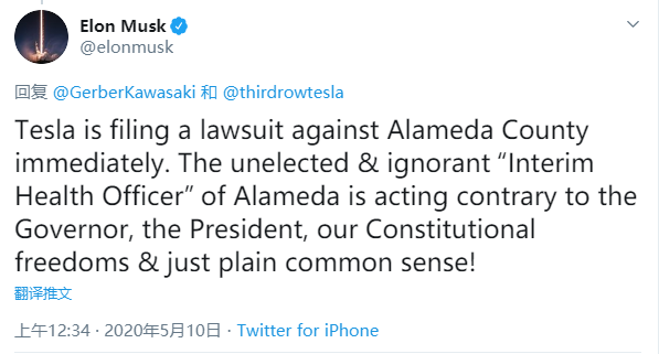 心急火燎的马斯克开始在推特上「威胁」当地有关部门,「特斯拉将会向 Alameda 县政府发起诉讼,当地未经选举且无知的临时卫生官员已经违反了州政府、总统的命令,侵犯了宪法赋予人民的权利,甚至背离了最基本的常识」。