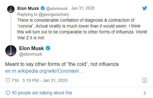 1 月 31 日,连特朗普的「大号流感论」都还没成为热点的时候,马斯克就曾在推特上引用维基百科并表示,「Meant to say other forms of “the cold”, not influenza(意思是‘冠状病毒’是感冒的另一种形式,甚至不是流感)」。