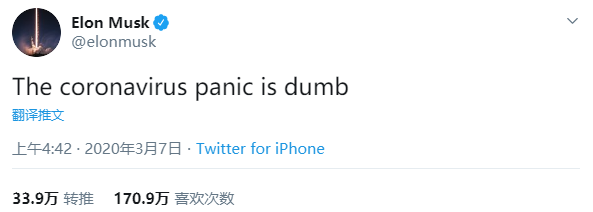 到了 3 月 7 日,美国感染人数排名全球第 9,但死亡率排名全球第二――这意味着美国有大量未发现的感染人数,而马斯克在推特说「冠状病毒恐慌是愚蠢的」。