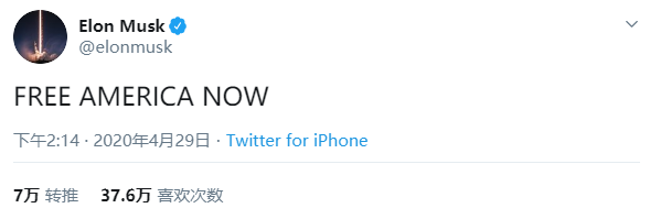 其实在一季度财报会议之前,马斯克就已经发了一条引爆网络的推特――「Free America now(解放美国刻不容缓)」