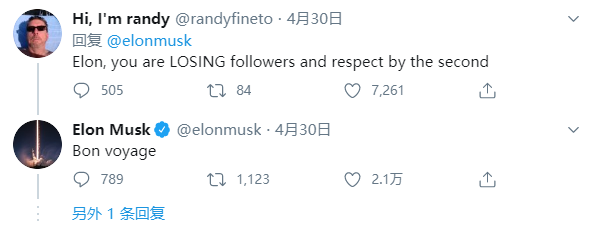 这条推特下面,是无数追随者的失望:「马斯克你正在失去你的粉丝和地位」、「我第一次和我的偶像产生分歧」。但马斯克显然不以为意,甚至对粉丝用法语说了再见: