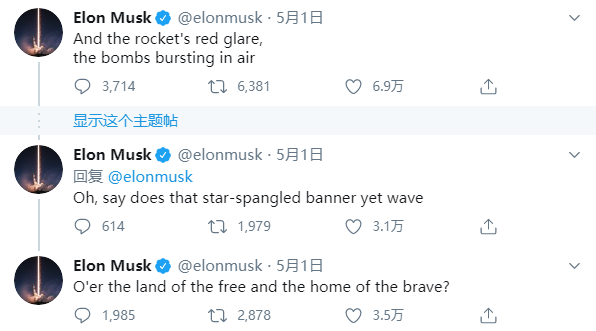 马斯克引用的这三句歌词,中文翻译是「火炮闪闪发光,炸弹轰轰作响。你看星条旗不是还高高飘扬,在这自由国家,勇士的家乡?」有趣的是,它们中间还有一句「Gave proof through the night that our flag was still there」,中文翻译为「它们都是见证,国旗安然无恙」。