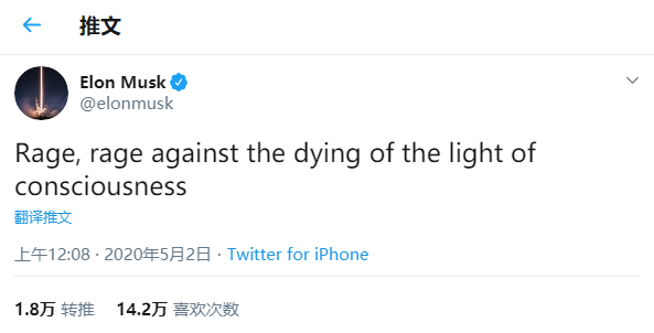 可能觉得引用国歌还不够,马斯克又在推特上面引用了 20 世纪英国著名作家狄兰・托马斯代表作《不要温和地走进那个良夜》的其中一句「Rage, rage against the dying of the light」,然后加了两个单词,变成了「Rage, rage against the dying of the light of consciousness.」