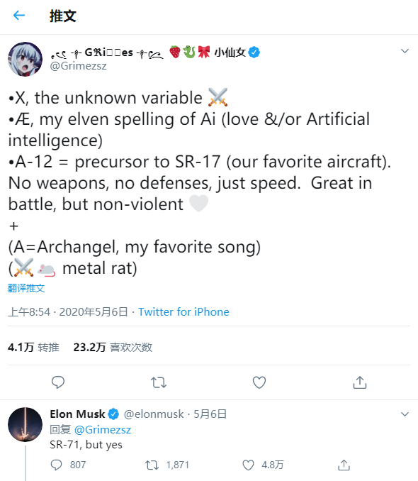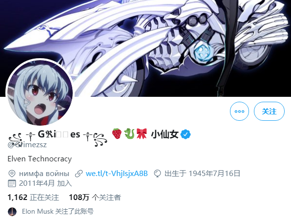 这里再插一段,Grimes 的推特那叫一个酷炫,头像是动漫《Interspecies Reviewers》里面的人气角色,签名是「精灵治国」;推特出生日期是人类第一次核试验的日期;名字里面除了 Windows 10 显示不出来的部分乱码,还有三个显眼的汉字「小仙女」,ヤmの汰孓Уǔ。