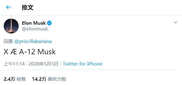 当地时间 4 号,在 Grimes 宣布将让孩子自己选择性别(???)的时候,马斯克已经按捺不住,在推特上表示「是个男孩」,然后顺便公布了孩子的名字――X A-12 Musk。