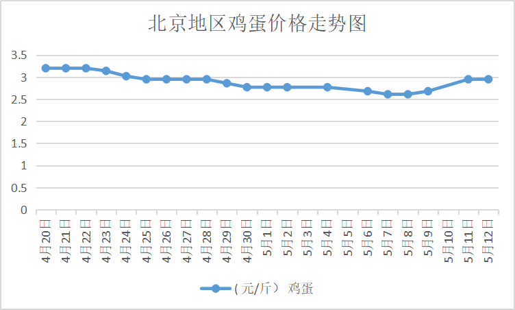 5月12日,北京大洋路鸡蛋主流批发价130-135元/44斤,稳,到货9台车,按质高低价均有,到货偏多,走货正常;回龙观鸡蛋130元/44斤,稳;顺义石门鸡蛋130元/44斤,稳。