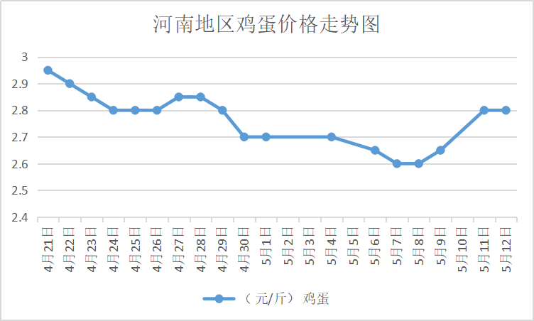 5月12日,河南荥阳鸡蛋2.8元/斤,稳;中牟鸡蛋2.8元/斤,稳;周口鸡蛋2.75元/斤,稳;商丘鸡蛋81元/30斤,稳;鹤壁鸡蛋2.75元/斤,稳;汝州鸡蛋2.8元/斤,稳;开封鸡蛋82-83元/30斤,稳;漯河鸡蛋2.8元/斤,稳;漯河临颍鸡蛋2.8元/斤,稳;许昌鸡蛋2.75元/斤,稳;南阳鸡蛋2.7元/斤,稳;南阳邓州鸡蛋2.7元/斤,稳;新乡鸡蛋2.75元/斤,稳;安阳鸡蛋2.75元/斤,稳;新郑鸡蛋2.8元/斤,稳;登封鸡蛋2.8元/斤,稳;平顶山鸡蛋2.8元/斤,稳;驻马店鸡蛋2.8元/斤,稳;三门峡鸡蛋2.8元/斤,稳;焦作鸡稳2.75元/斤,稳;信阳鸡蛋2.75元/斤,稳;濮阳鸡蛋2.75元/斤,稳。