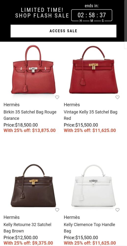还有不久前,美国奢侈品百货 NeimanMarcus 官网的二手爱马仕―铂金包和凯莉包突然打折,折扣力度在7.5至9折之间不等,是不是表示劳斯莱斯半价指日可待了?(不是