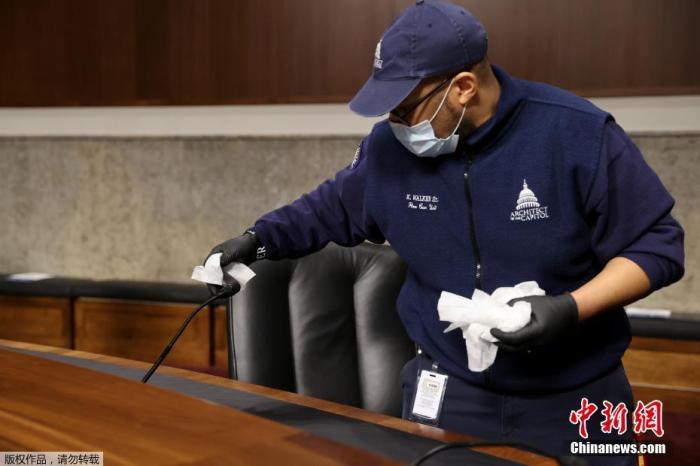 当地时间5月6日,美国华盛顿,工作人员佩戴口罩在国会大楼内进行清理消杀工作。在参议院委员听证会之间,擦桌子换桌布,并对椅子以及话筒进行清理。