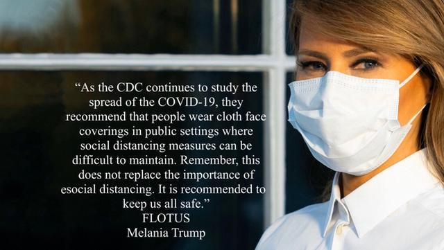 梅拉尼娅是特朗普全家中第一个戴口罩的人。4月9日,她在社交媒体发布了一张戴口罩的照片,鼓励美国民众戴口罩。