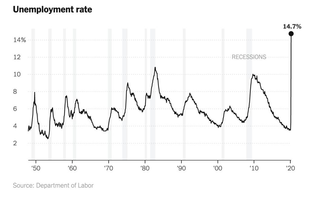 《纽约时报》在报道中提到,4月以来美国经济进一步陷入危机,失业人数达2050万,失业率飙升至14.7%,创大萧条以来最高值。
