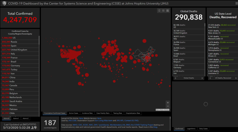 据美国约翰斯・霍普金斯大学实时统计数据,截至北京时间5月13日5时32分,全球新冠肺炎确诊病例累计4,247,709例,死亡290,838例。其中,美国确诊超136.6万,俄罗斯超23.2万,西班牙超22.8万,英国超22.7万,意大利超22.1万,法国超17.8万,巴西超17.31万例,德国超17.3万例,土耳其超14.1万,伊朗超11万例,是全球确诊病例最多的10个国家。