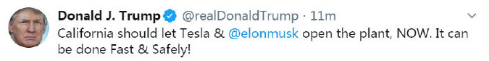 当地时间11日,北加州旧金山湾区弗里蒙特的特斯拉工厂不顾当地的停工规定,恢复汽车生产。而特朗普发推表示,加州现在应当让特斯拉重开当地的工厂。