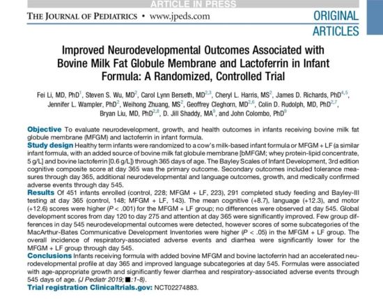 今年10月,国际知名期刊《儿科学杂志》刊发一篇乳脂球膜和与乳铁蛋白配方奶粉的研究成果,明确指出婴儿出生后第一年(出生后14天至365天)喂养添加乳脂球膜与乳铁蛋白的婴儿配方奶粉与显著改善神经发育和免疫健康有关。