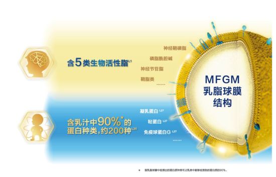 乳脂球膜(MFGM)是母乳中重要成分,含5类生物活性脂与乳汁中90%的蛋白种类,超过200种成分,在婴幼儿生长发育中发挥着促进髓鞘形成及突触信号传递、支持神经髓鞘的生成、支持肠道内稳态、抵抗微生物等多重作用。