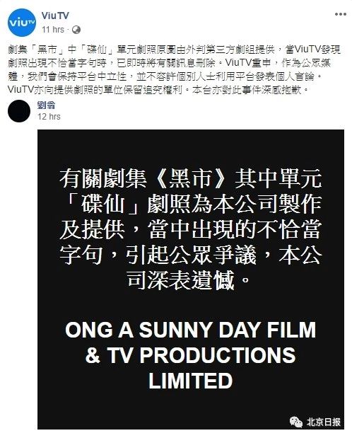 随后ViuTV引用刘翁帖文,称剧照原图是由外判第三方剧组提供,当发现不恰当字句时已即时删除。ViuTV表示,作为公众媒体,会保持平台中立性,不容许个别人士利用平台发表个人言论。ViuTV将向提供剧照的单位保留追究权利,并对此事深感抱歉。