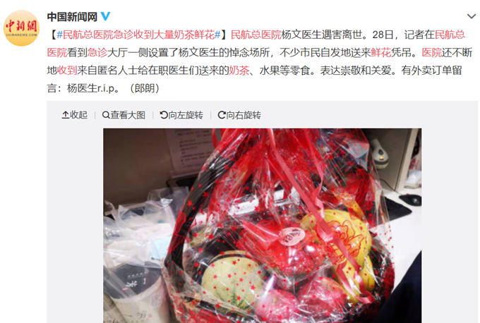 医院还不断地收到来自匿名人士给在职医生们送来的奶茶、水果等零食。表达崇敬和关爱。有外卖订单留言:杨医生r.i.p。