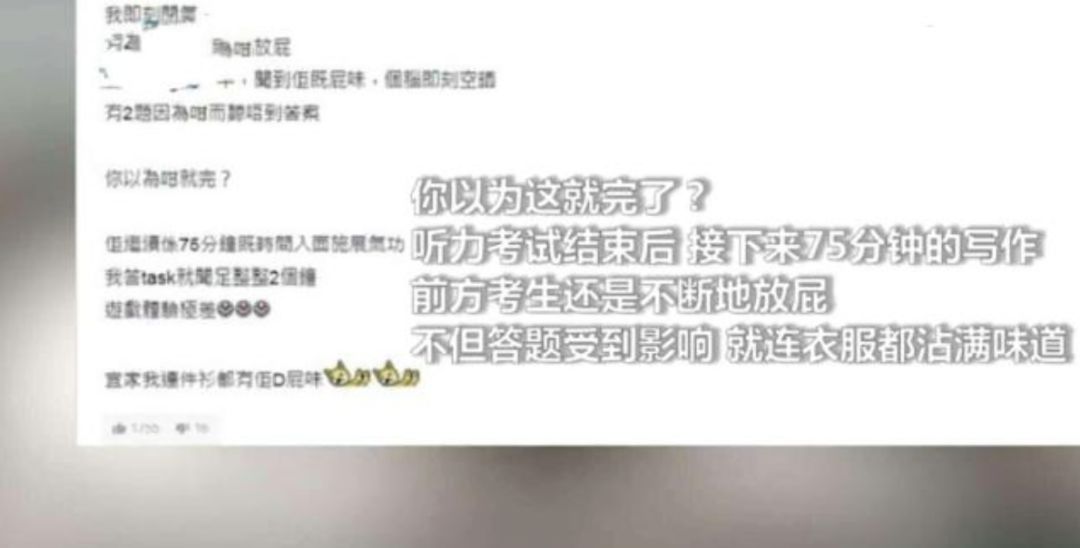 这位网友在社交网络发帖表示,在6日举行的香港中学文凭考试中,自己前座的考生一直放屁,导致自己无法集中精力考试。