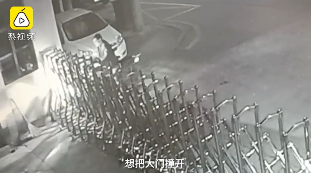 邵某欲骑着摩托车把大门撞开跟狗再战