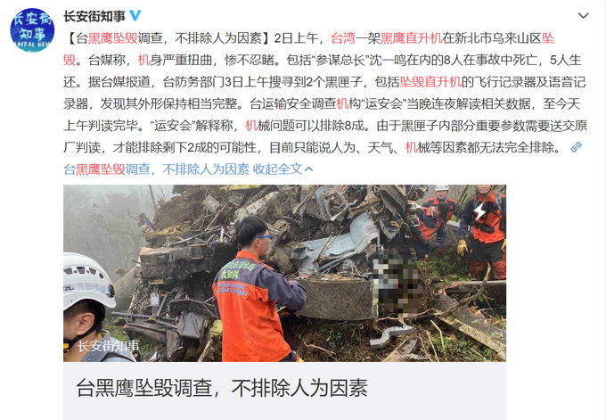 长安街知事(微信ID:Capitalnews)注意到,这是2年内台湾地区第二起“黑鹰坠机”事故。