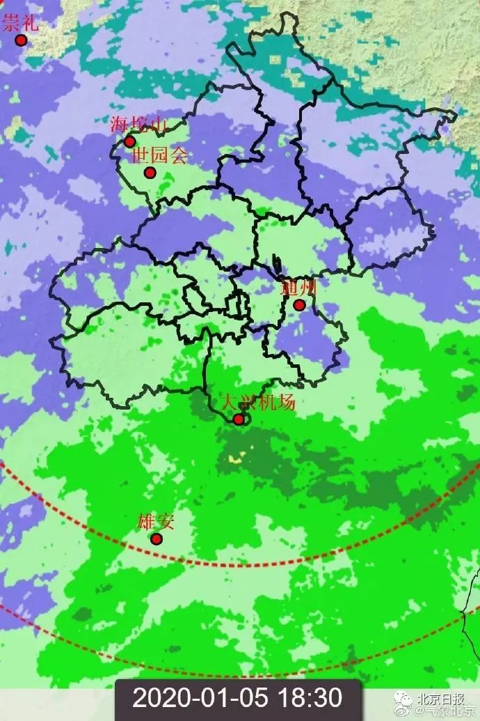 根据18时30分的雷达回波,北京的西南部山区如霞云岭、斋堂,还有西北部的延庆,已陆续出现降雪。陆陆续续,大兴、昌平等地都下起来了。
