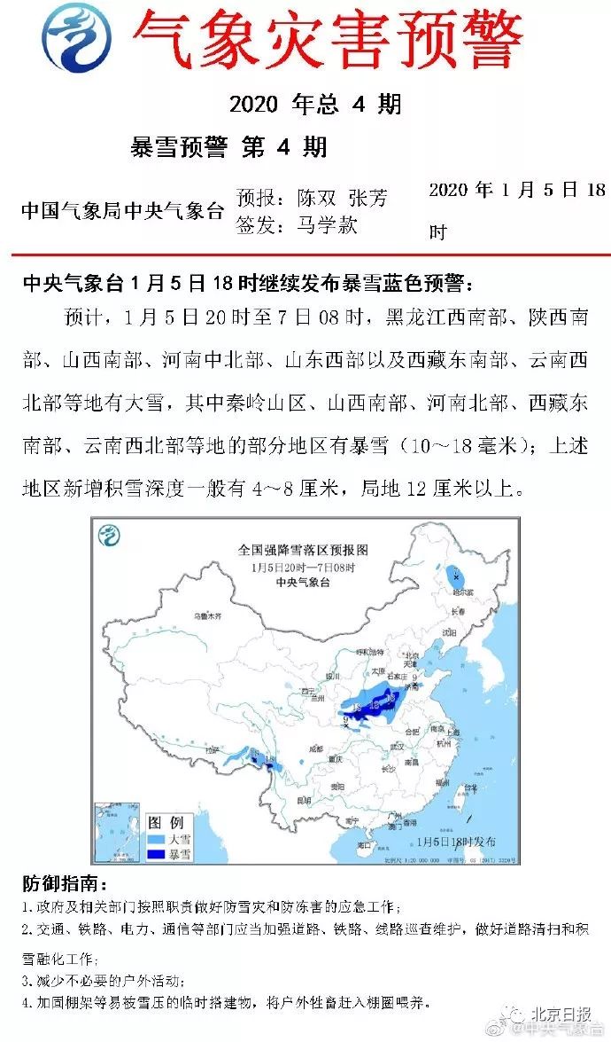 中央气象台1月5日18时继续发布暴雪蓝色预警。从预警图看,北京并不在暴雪蓝色预警范围内。这次影响北京的,很有可能只是一场小雪。