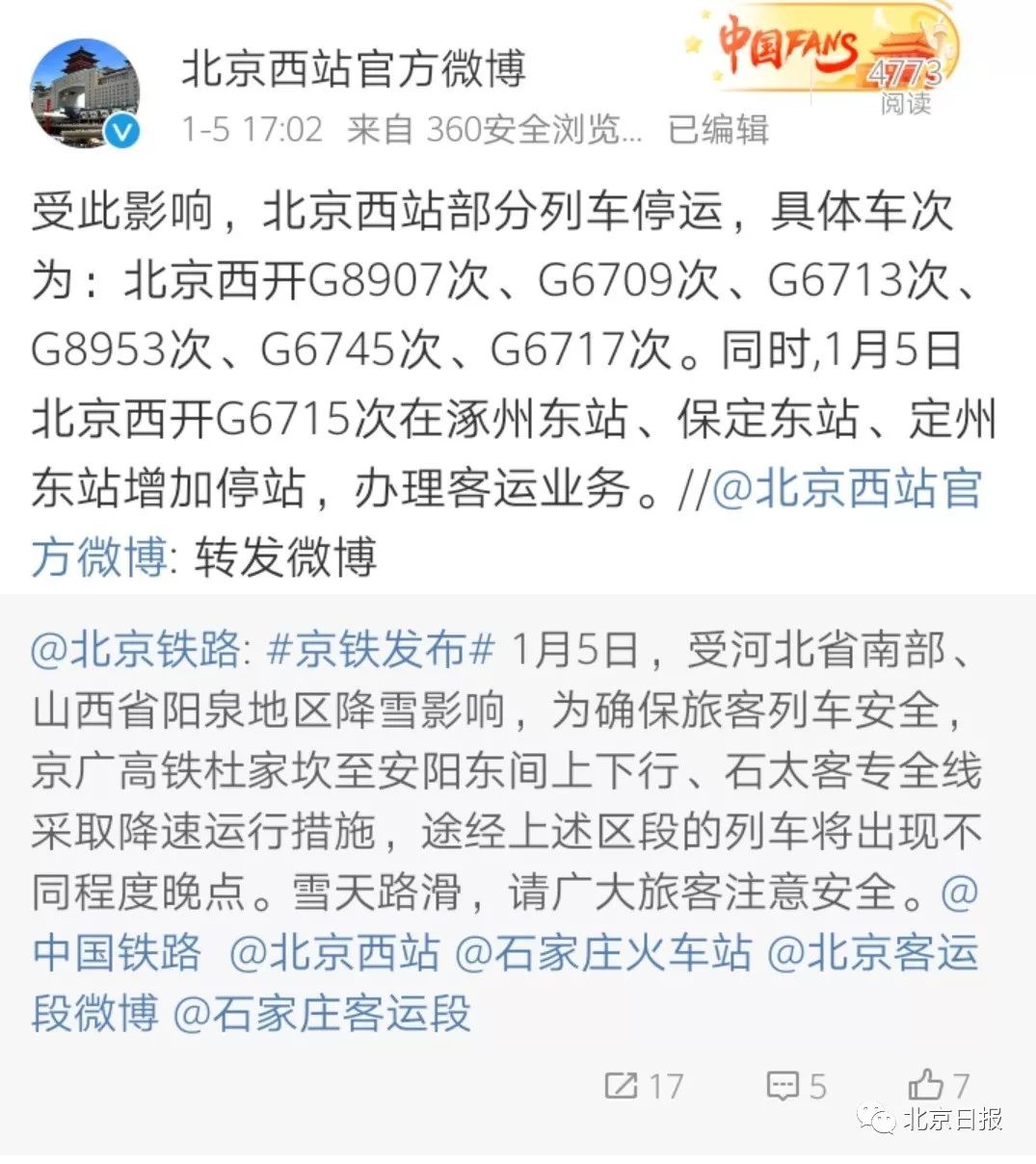 受此影响,北京西站部分列车停运,具体车次为:北京西开G8907次、G6709次、G6713次、G8953次、G6745次、G6717次。同时,1月5日北京西开G6715次在涿州东站、保定东站、定州东站增加停站,办理客运业务。
