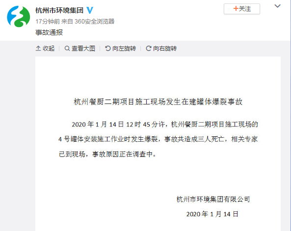 1月14日12时45分,杭州餐厨二期项目施工现场的4号罐体安装施工作业时发生爆裂,共造成3人死亡,事故原因正在调查中。