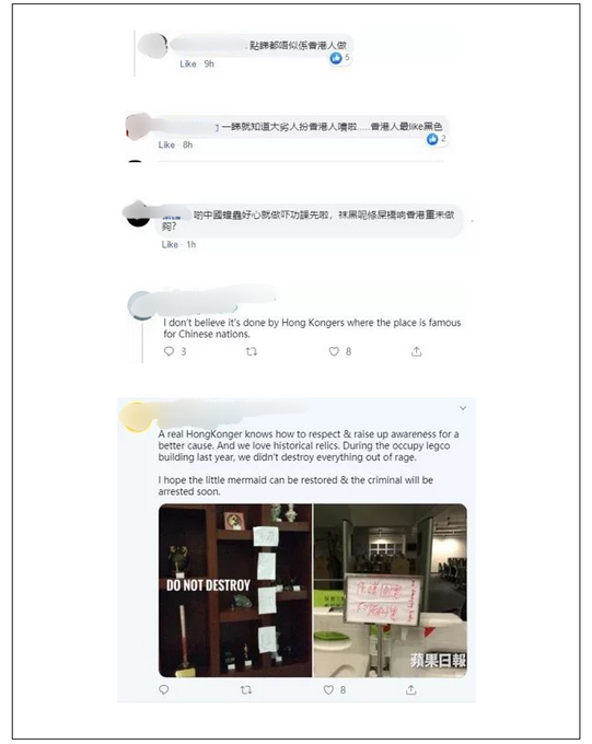 首先,他们中有一部分人居然将这个破坏铜像的可耻做法推给了内地人,称这种不文明的行为香港人做不出来,只有内地人才做得出来。