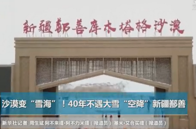 1月14日晚至15日,新疆吐鲁番市鄯善县迎来2020年首场降雪。据鄯善县气象局公布消息,此次最大降雪量达9.8毫米,雪深10厘米,是该县40多年来最大降雪量。紧邻鄯善县的库木塔格沙漠一片雪白,降雪覆盖在沙浪上,犹如一片“雪海”。