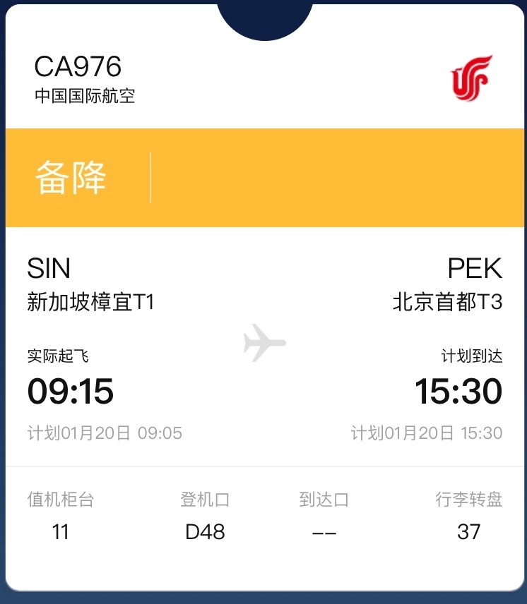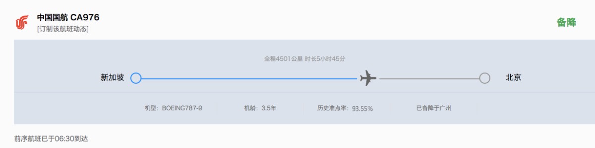 刚刚,据航空自媒体“航空物语”报道,国航CA976新加坡飞北京的航班目前备降广州,机型为波音787-9,具体原因未明。