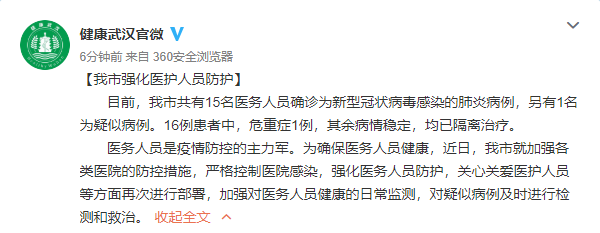 此外,据武汉市卫健委:目前,武汉市共有15名医务人员确诊为新型冠状病毒感染的肺炎病例,另有1名为疑似病例。16例患者中,危重症1例,其余病情稳定,均已隔离治疗。