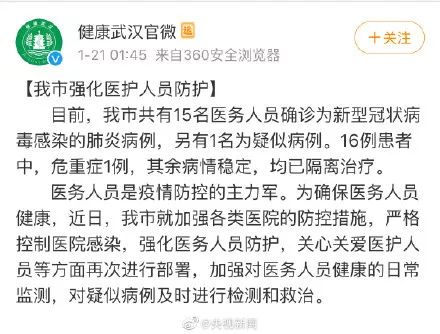 武汉市共有15名医务人员