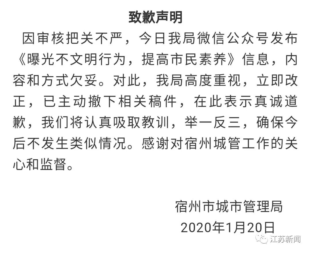 20日晚,宿州市城市管理局通报称,因审核把关不严,其微信公众号发布《曝光不文明行为,提高市民素养》信息,内容和方式欠妥。对此,宿州市城市管理局高度重视,立即改正,已主动撤下相关稿件,并表示真诚道歉,确保今后不发生类似情况。