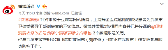 22日,@微博辟谣也针对来源于豆瓣等网站所谓,上海瑞金医院逃跑的肺炎患者为武汉市卫健委领导干部刘庆香的不实信息做出回应:“微博共发现3条相同内容并已将传谣的@印钱消费@修改名号@嗲宁搭嗲表嗲宁拎嗲包 3个微博账号关闭。” @微博辟谣称,经与武汉市政府相关部门核实,“该同志(刘庆香)目前正在武汉市工作专班参与肺炎防控工作”。